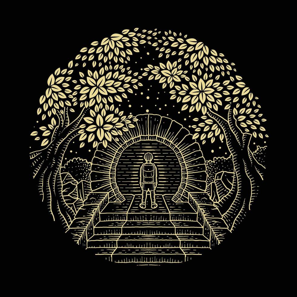 Ancient Gate to Another Dimension in a Haunted Forest in Hand-Drawn Engraving and Pointillism Style Pro Vector