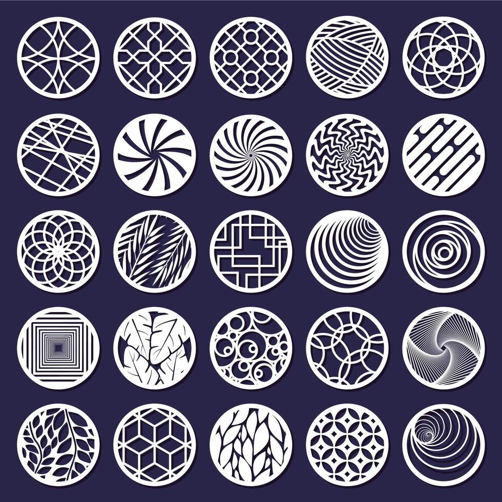 Laser cut round abstract decorative pattern template. Abstract decorative circle cutting panels isolated illustration set. Round geometric pattern panels Pro Vector
