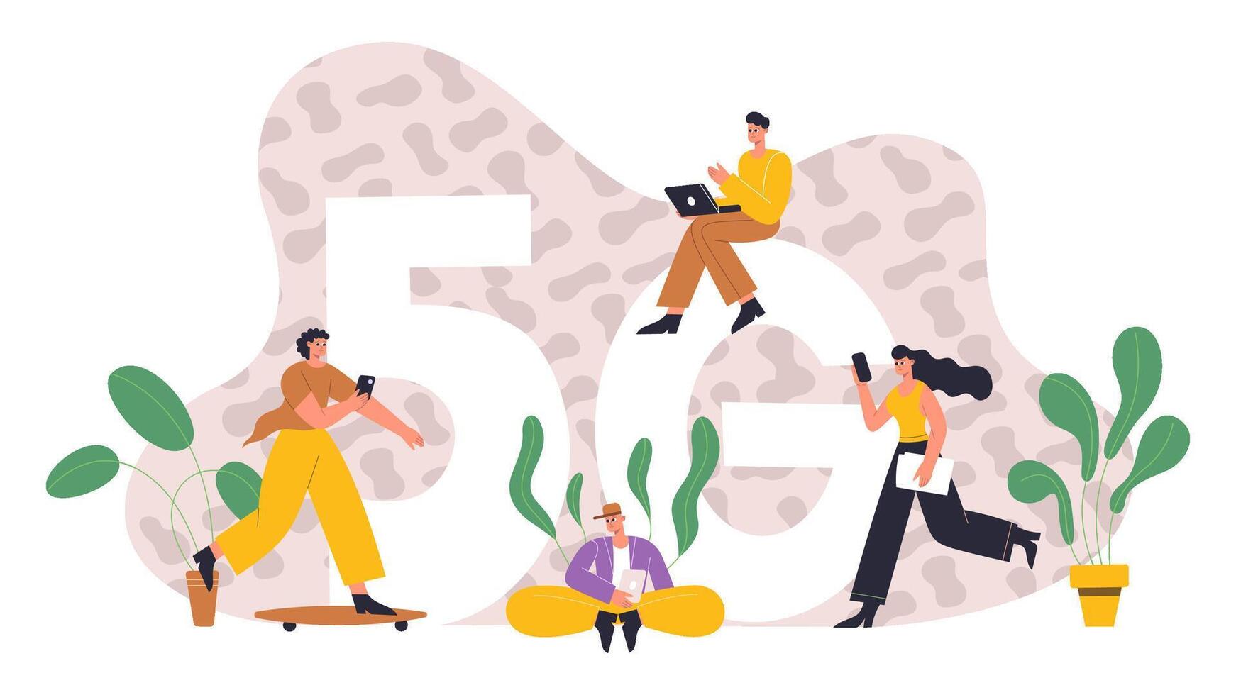 People use mobile internet, wireless 5G internet connection. Wireless high speed internet, characters using network technology flat illustration. High speed internet Pro Vector