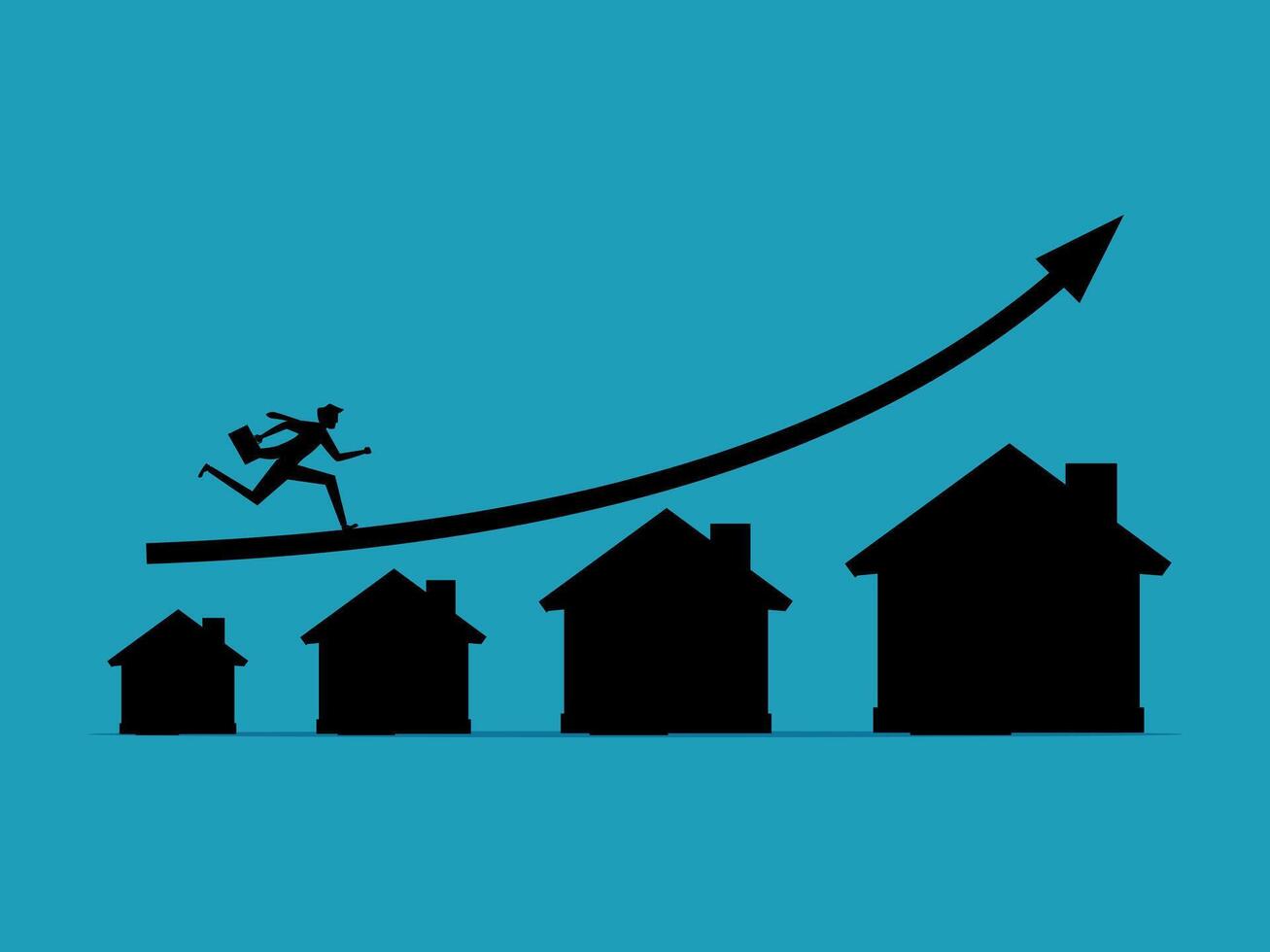 a man running up a graph of houses and an arrow pointing up Pro Vector