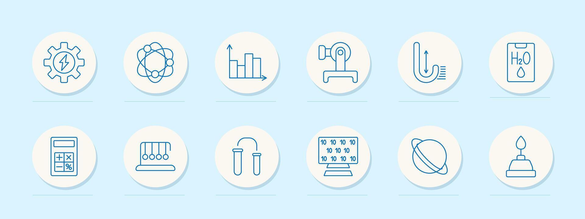 Education set icon. Calculator, atom, graph, and book. Learning, science, mathematics, and knowledge concept. Pro Vector