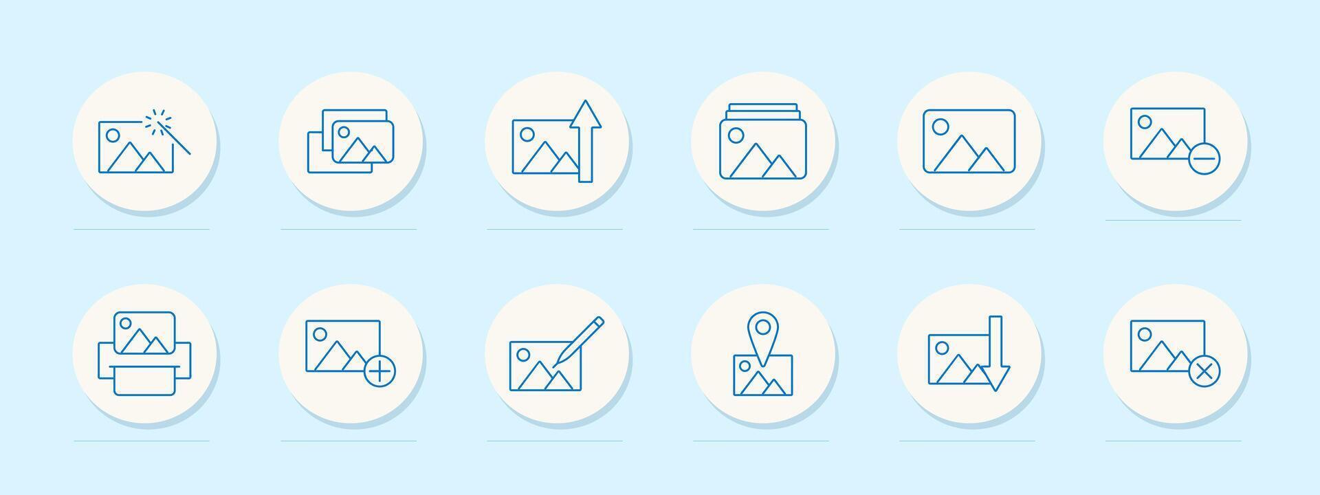 Photo editing set icon. Magic wand, image stack, growth chart, folder, print, pencil, map pin, arrow down, delete. Editing, enhancement, photography tools concept. line icons on blue background Pro Vector