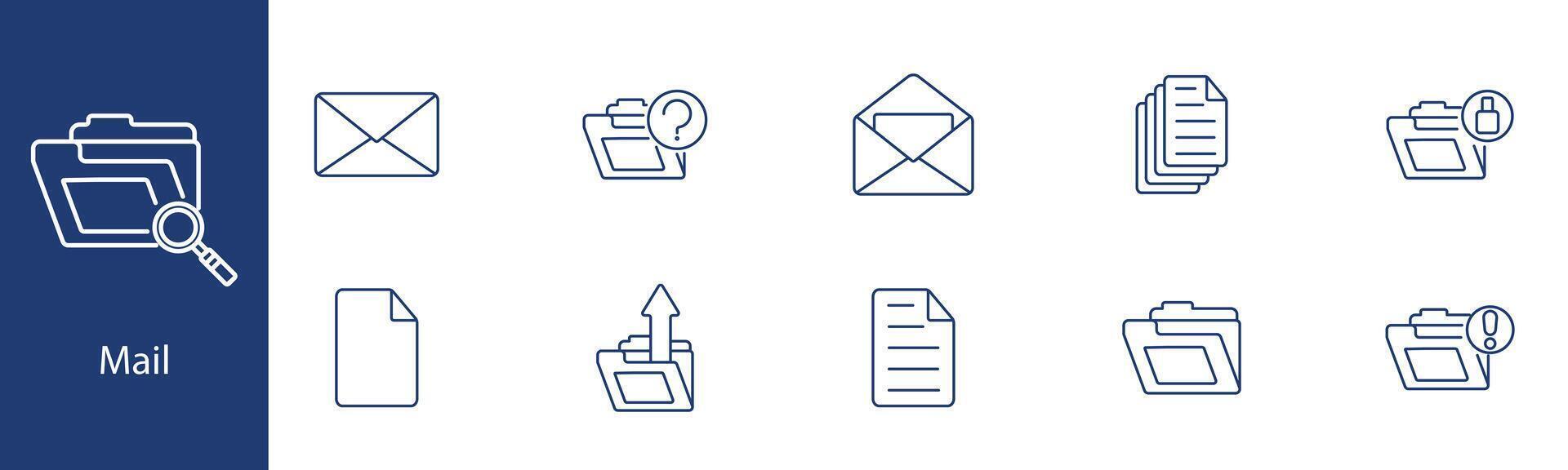 Mail set icon. Folder, email, document, search, sent, received, question, alert. Communication, correspondence, office concept. Pro Vector