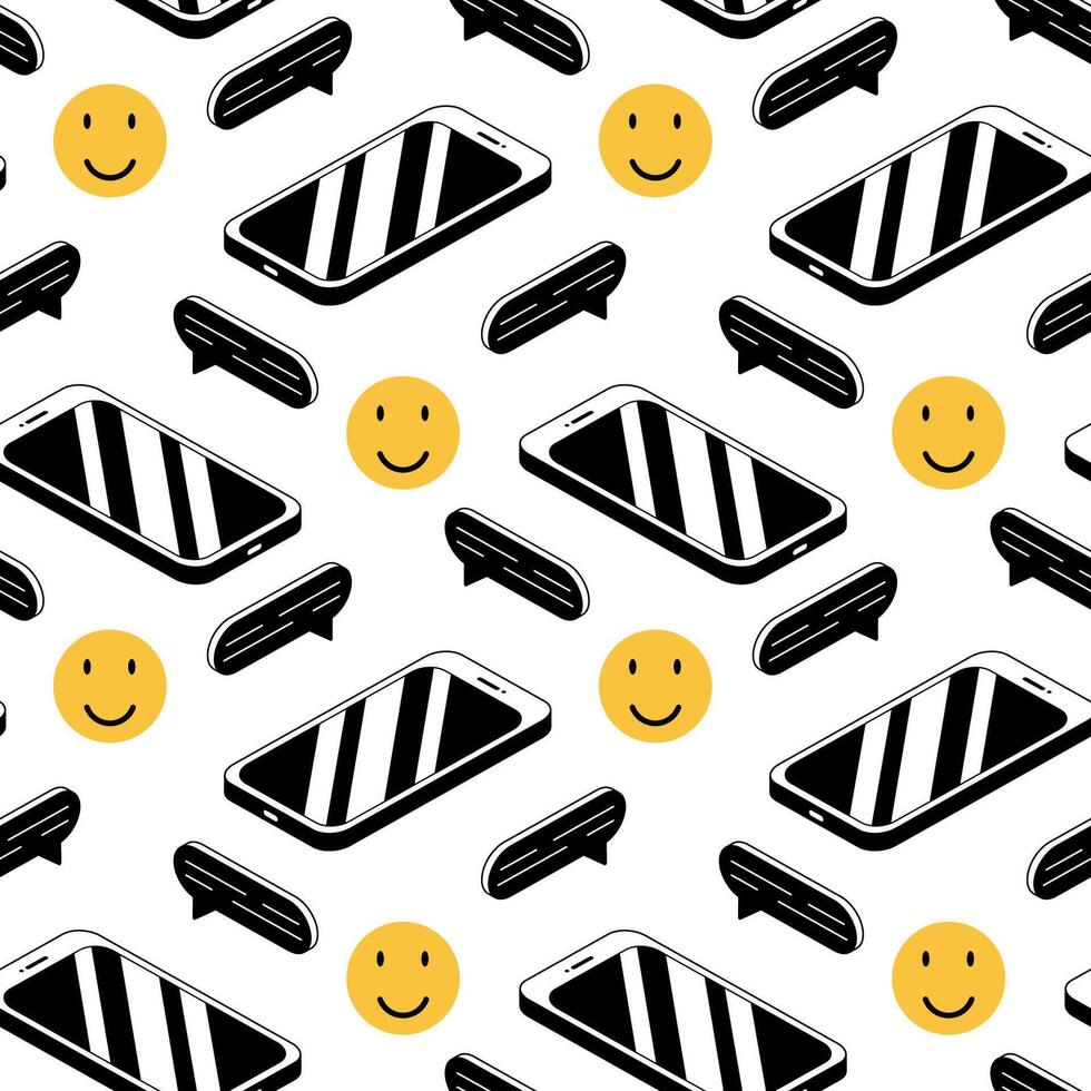 Seamless pattern with mobile phone and pop-up messages. Illustration of isometric mobile gadget. Black and white drawing of smartphone. Online communication and talk. Pro Vector