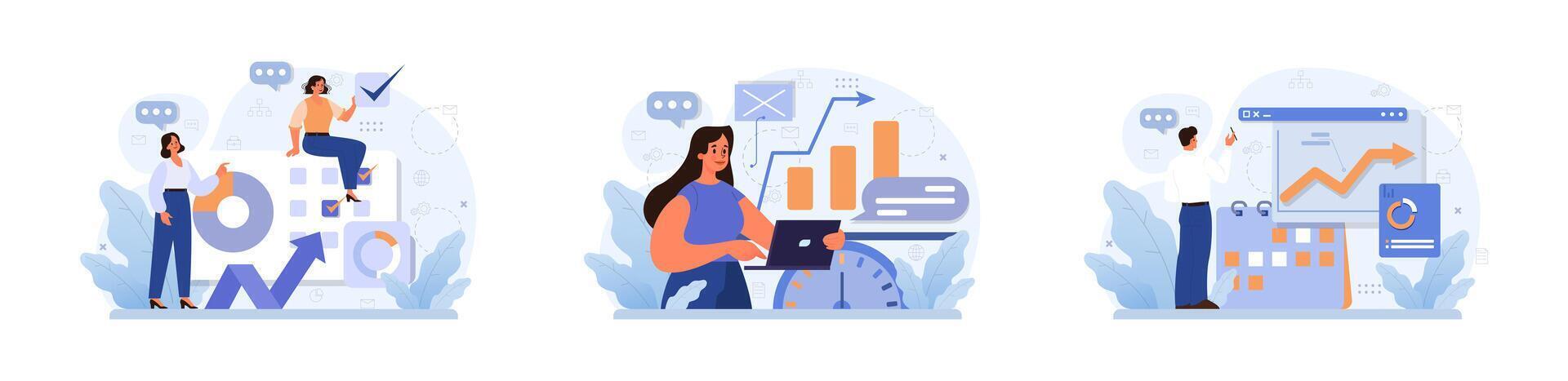 Progress set. Work optimization and efficiency. Character moving Pro Vector