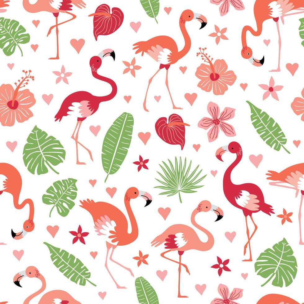 Pattern with pink flamingos and tropical leaves on a white background. Pink flamingo in flat style. Seamless pattern for textile, wrapping paper, background. Pro Vector
