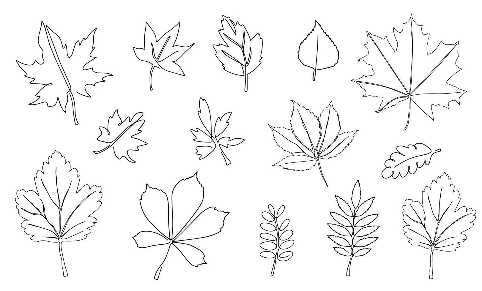 Set of autumn leaves drawn in a continuous line. Autumn leaf in one line style. Flower sketch. Composition of various leaves. Simple contour leaves. illustration in minimalist style. illustration Pro Vector