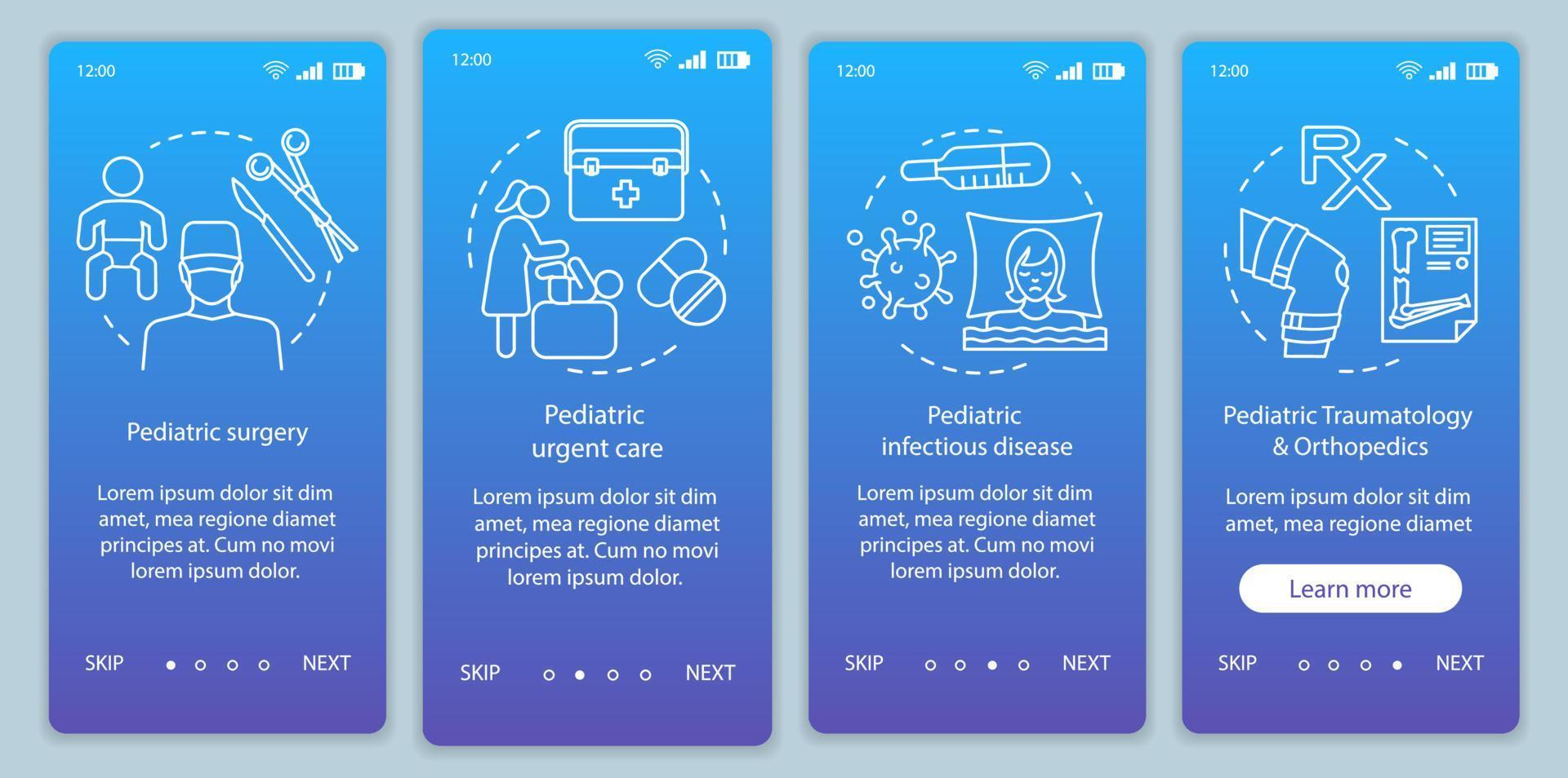 Pediatrics services onboarding mobile app page screen vector template. Surgery, urgent care, traumatology. Walkthrough website steps with linear illustrations. UX, UI, GUI smartphone interface concept Pro Vector and Pro SVG
