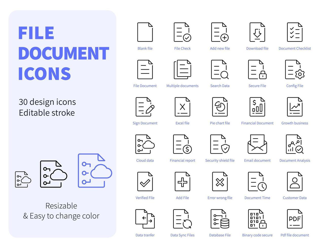 File Document Icons set. Such as financial report, cloud data, document analysis. Simple illustration editable stroke. Pro Vector