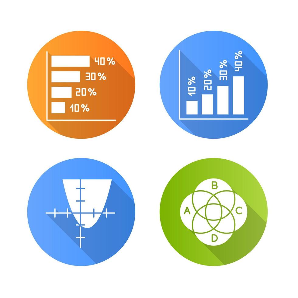 Chart and graph flat design long shadow glyph icons set. Horizontal and vertical histogram with interest rates. Function curve. Venn diagram. Trigonometry. Business. Vector silhouette illustration Pro Vector