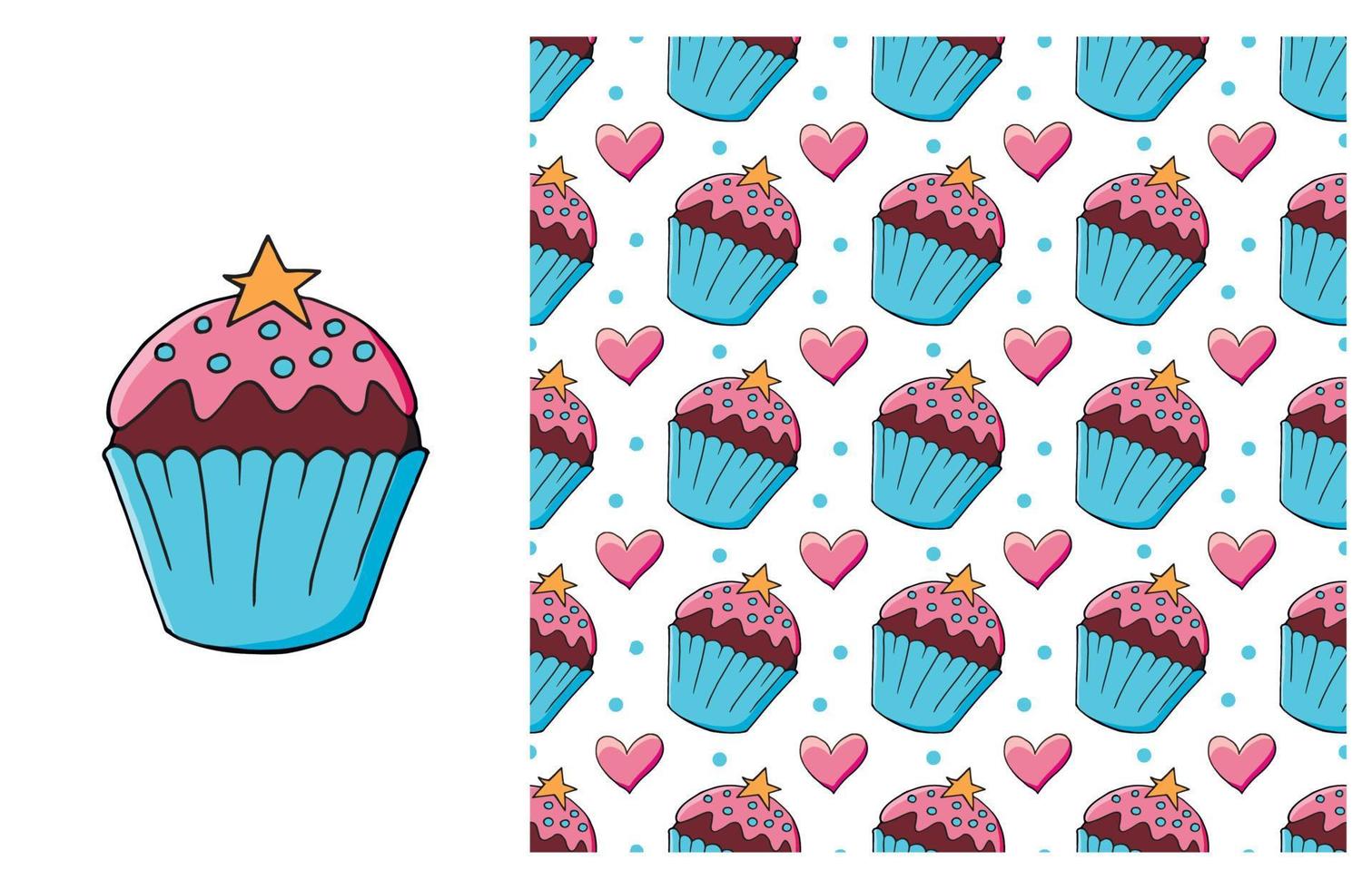 Cupcake, muffin. Set of element and seamless pattern Pro Vector