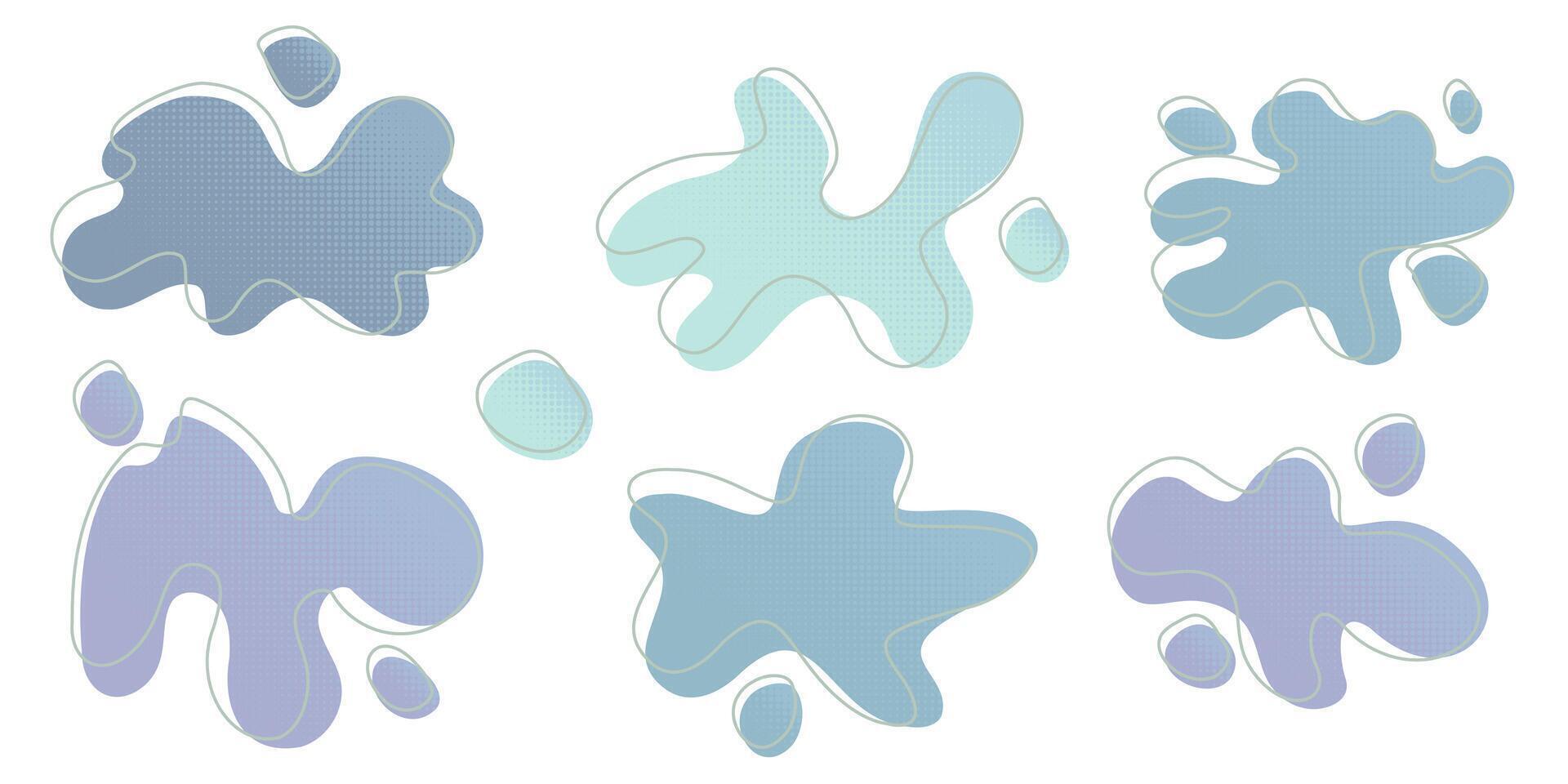 Blue liquid halftone drops water shapes set, splashes collection. Paint spot, blot, rain puddle, oil blobs. Irregular abstract graphic design elements Transparent background. illustration Pro Vector