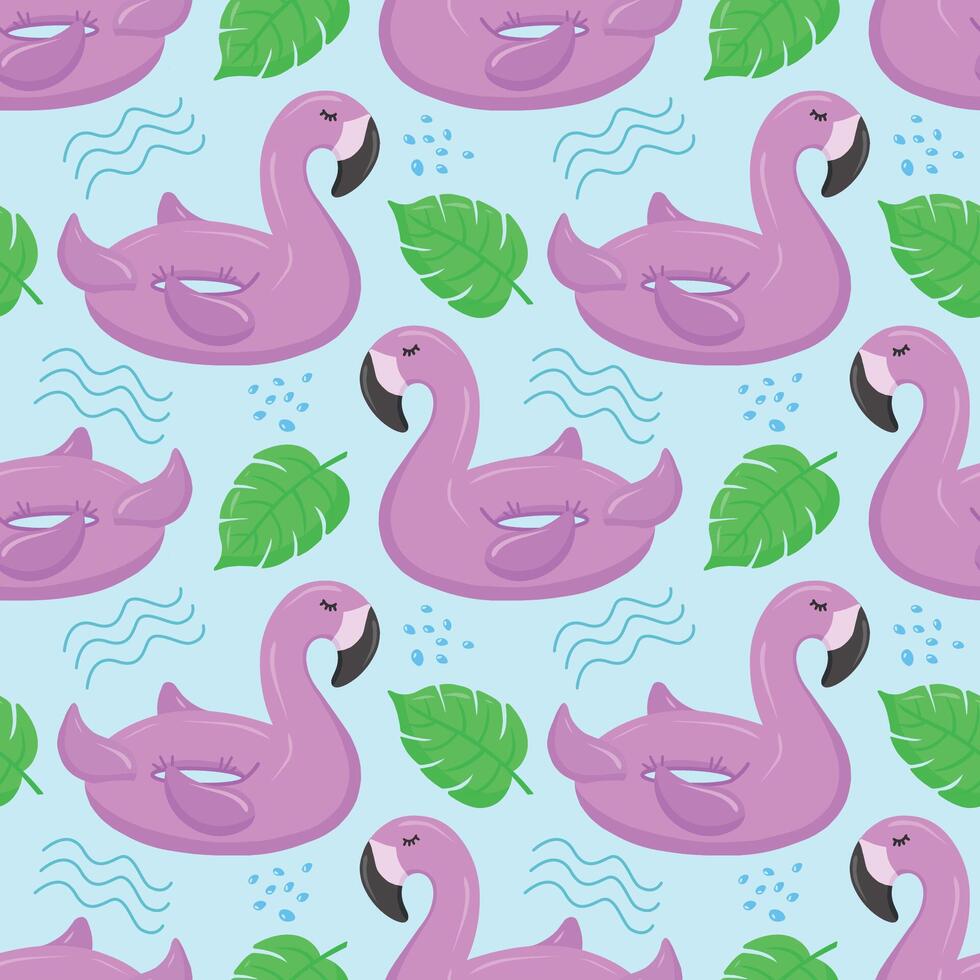 Seamless pattern with pink flamingos and palm leaves. A float for the pool. Inflatable pink flamingos. A swimming circle. pattern for your summer beach design Pro Vector