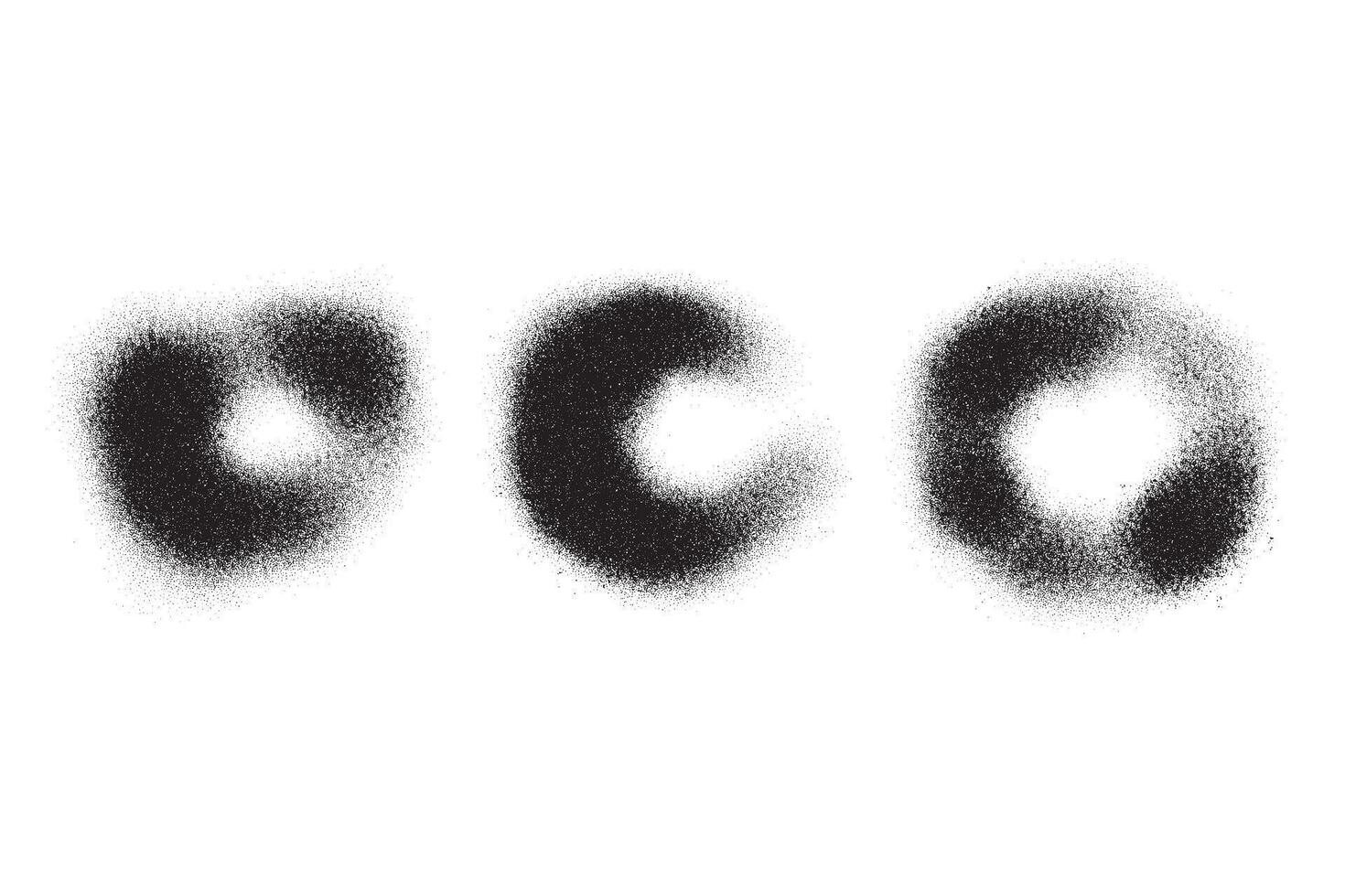 Grainy noisy gradient shadows. Stipple dotted circles with dust texture. Abstract halftone elements with spray texture. Grunge splashes and organic blobs. Fluid spots set. Pro Vector
