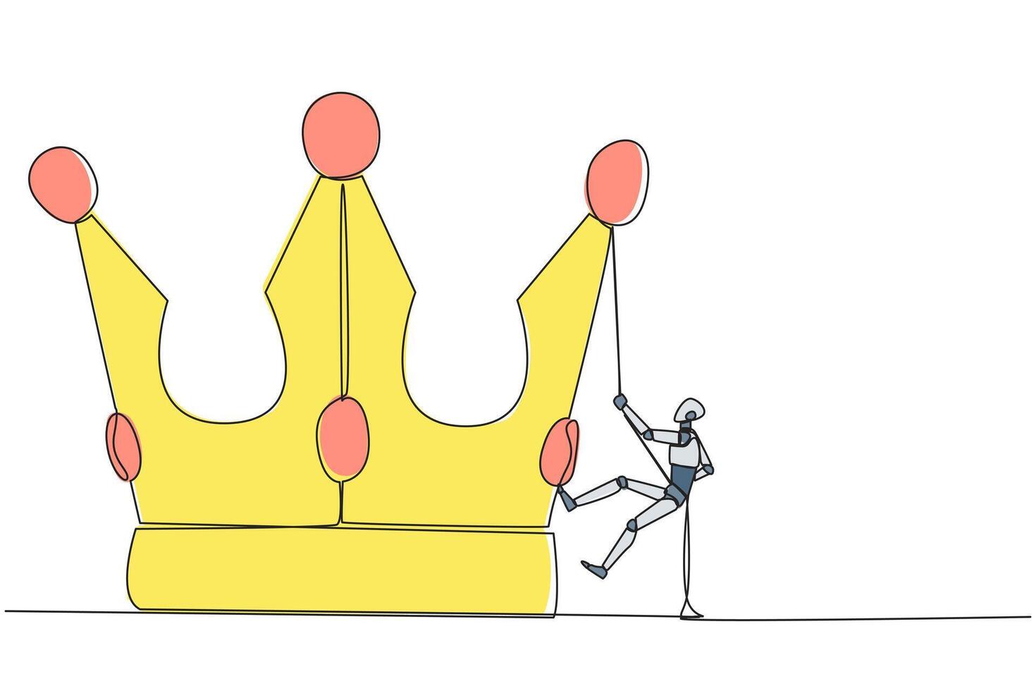 Continuous one line drawing the robot climbing crown with rope. Prepare for a better life by working hard to achieve the highest position. The hard worker. Single line draw design illustration Pro Vector