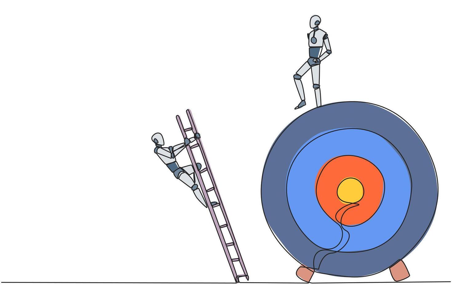 Single one line drawing the robot kicks colleague who is climbing the target arrow board with a ladder. The metaphor of getting rid of business destroyers. Continuous line design graphic illustration Pro Vector
