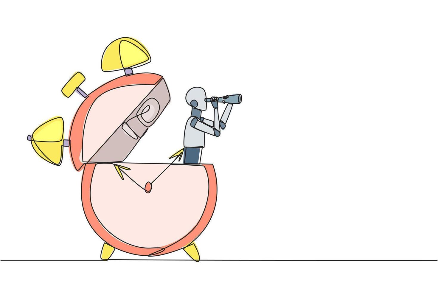 Single continuous line drawing smart robot appears from the alarm clock looking for something through binoculars. Alarm robot. Reminder robot. New technology clock. One line design illustration Pro Vector