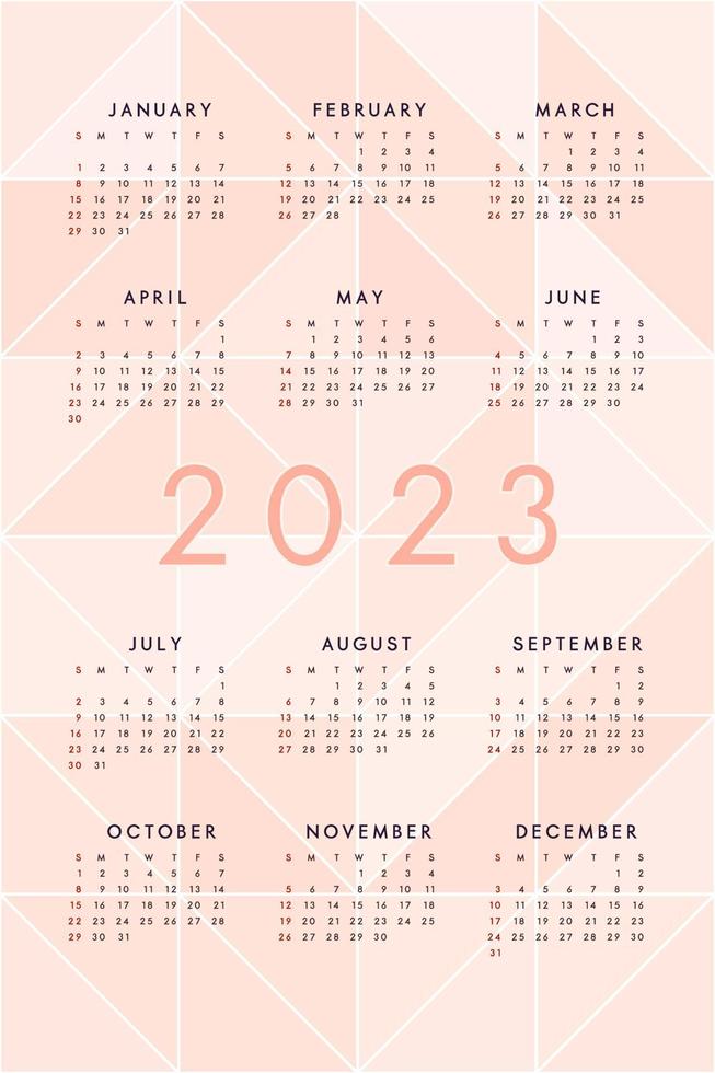 2023 calendar template with translucent peach pink triangles. Trende calendar design for print and web. Week starts on Sunday Pro Vector