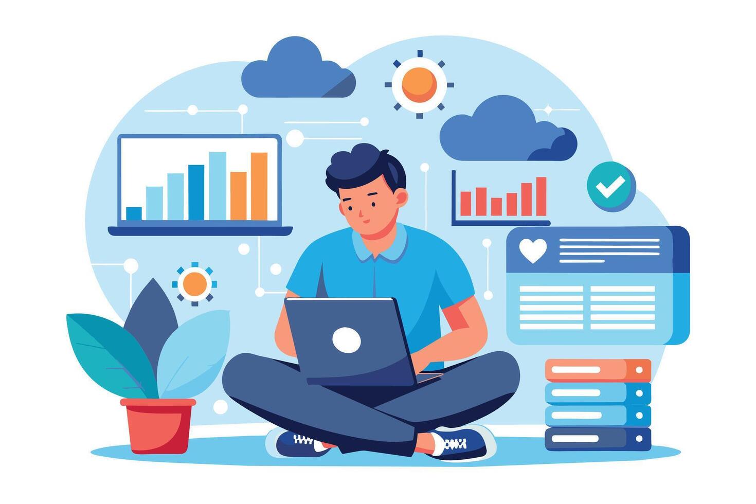 Illustration of a man working on a laptop with data analytics charts and cloud computing elements surrounding him, suggesting a focus on technology and growth. vector