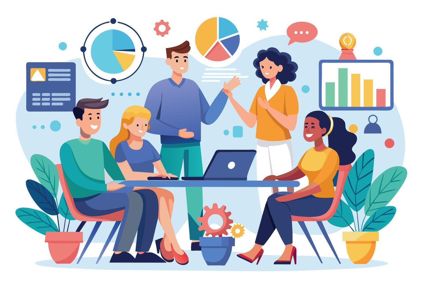 A diverse team of four people are gathered around a laptop, discussing data and charts in a business meeting. vector