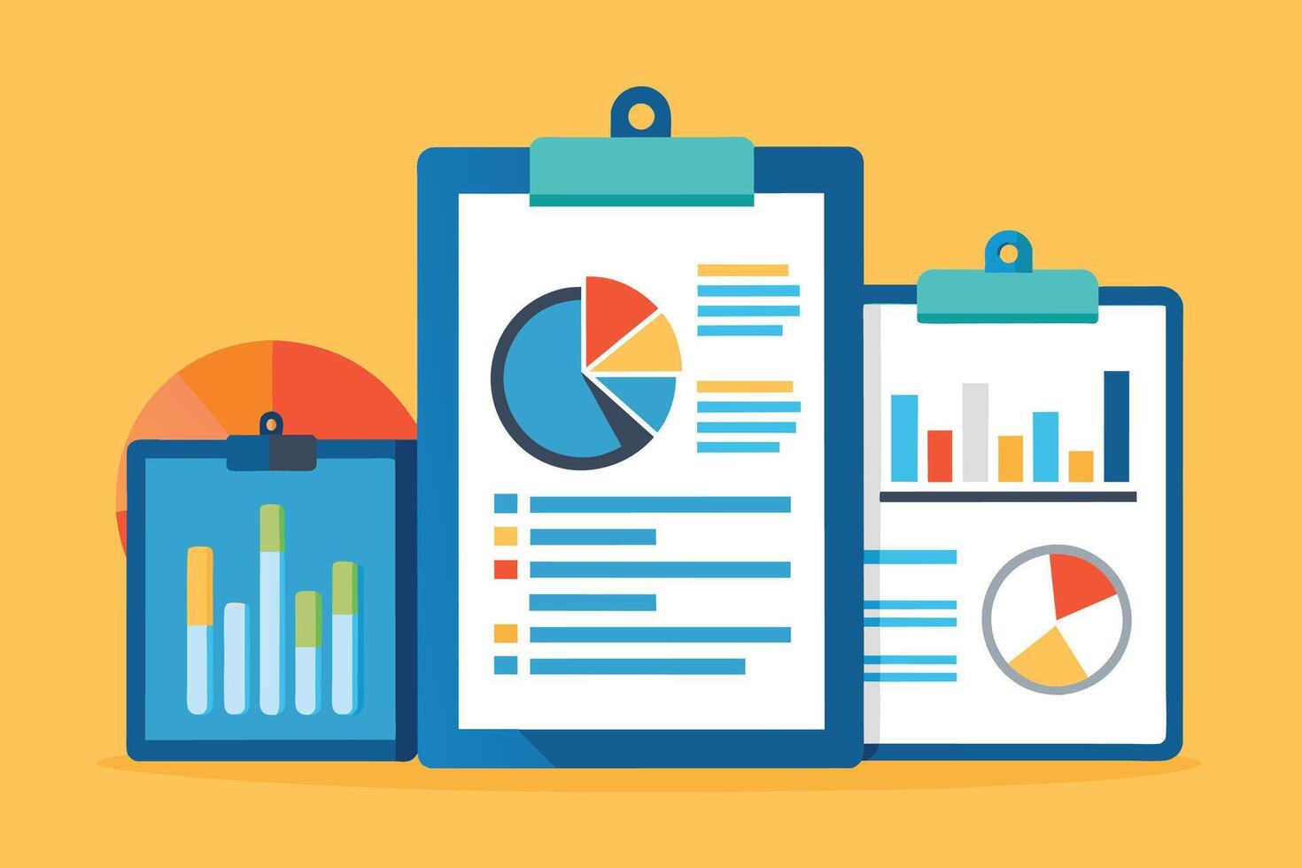 Three clipboards with different data visualizations on a yellow background. Free Vector