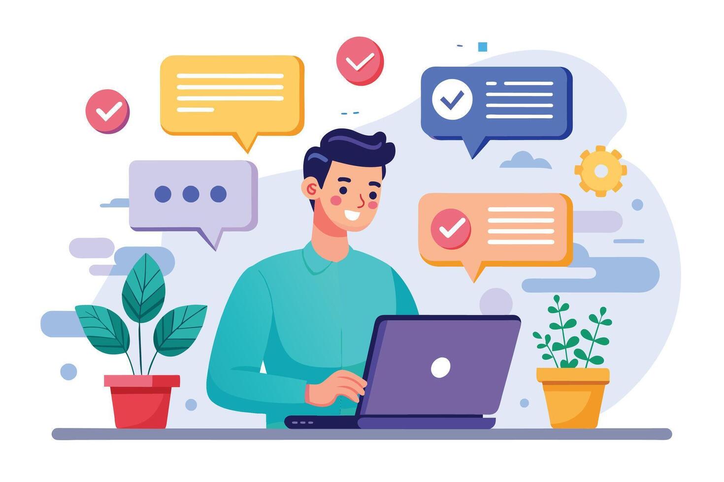 A smiling man works on his laptop in a home office with plants. He has checkmarks and speech bubbles with lines of text above him, symbolizing his completion of tasks. vector
