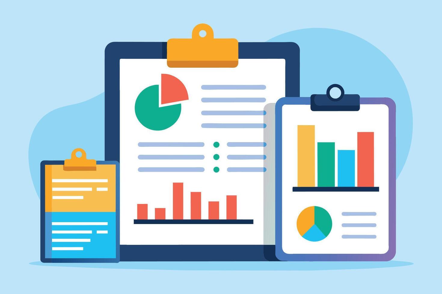 Illustration of three clipboards with different charts and graphs, including pie charts, bar graphs, and lines. vector