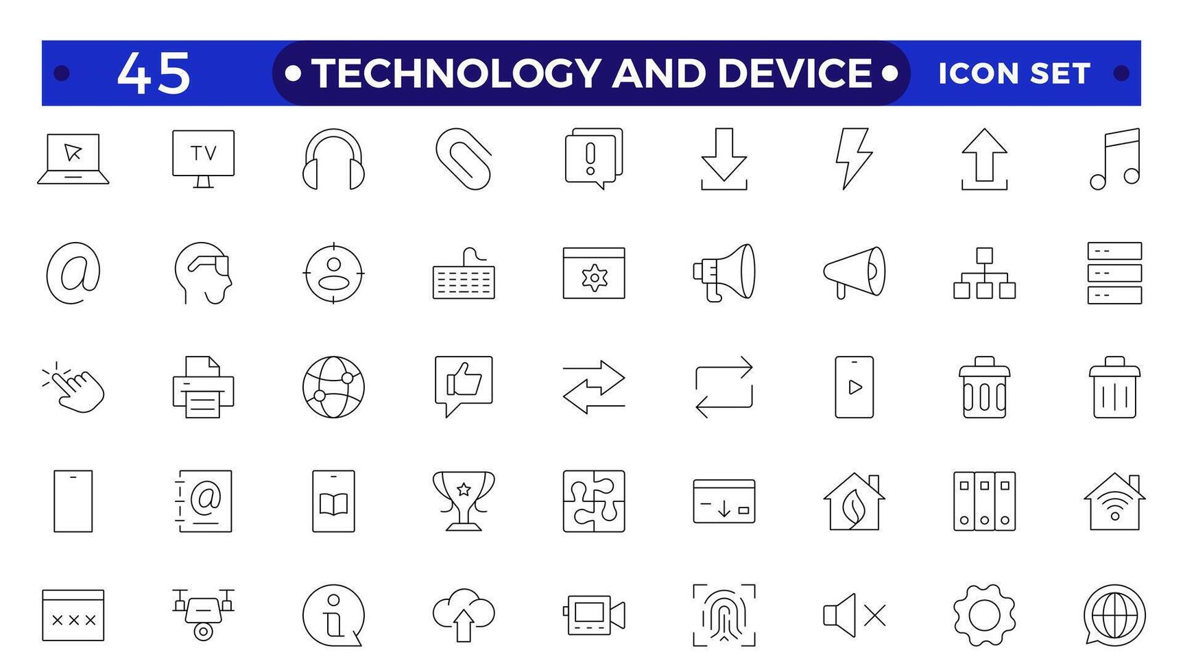 Technology and Device web icons in outline style. Computer monitor, smartphone, tablet, laptop, Mail, Search, Cloud, Media icon.Big UI icon set in a flat design. Technology and Device web icons. Pro Vector