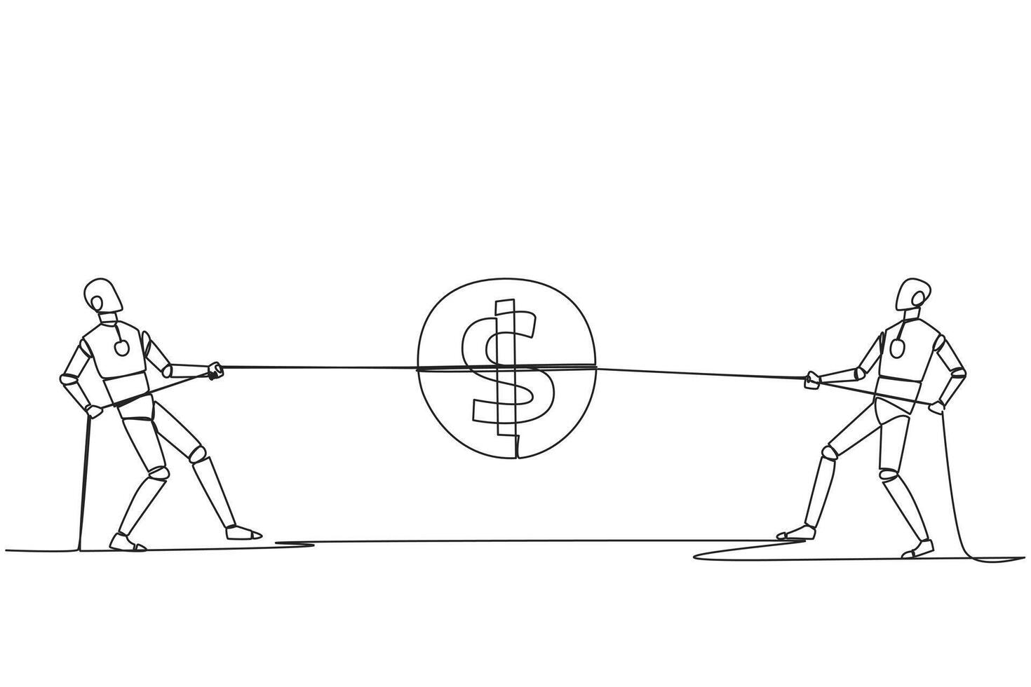 Single one line drawing two robots fighting over a coin with a dollar symbol. Competition for the highest payout for the smartest robots. Future technology. Continuous line design graphic illustration Pro Vector