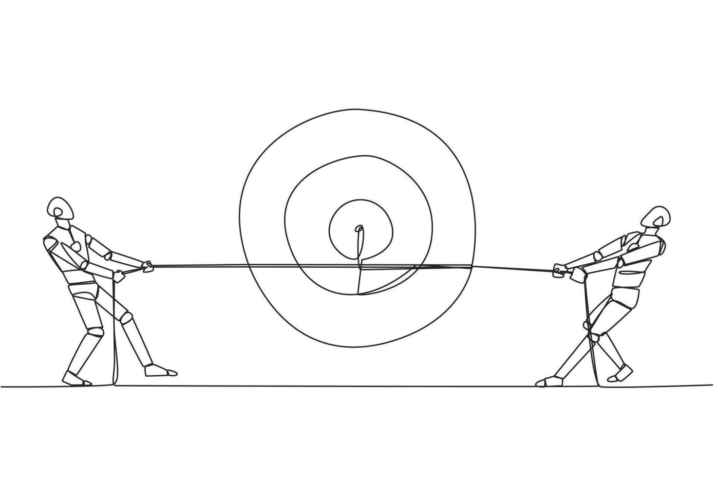 Single continuous line drawing two robots fighting over an arrow target board. Fierce competition towards the best goal of becoming the best robot. Future tech. One line design illustration Pro Vector