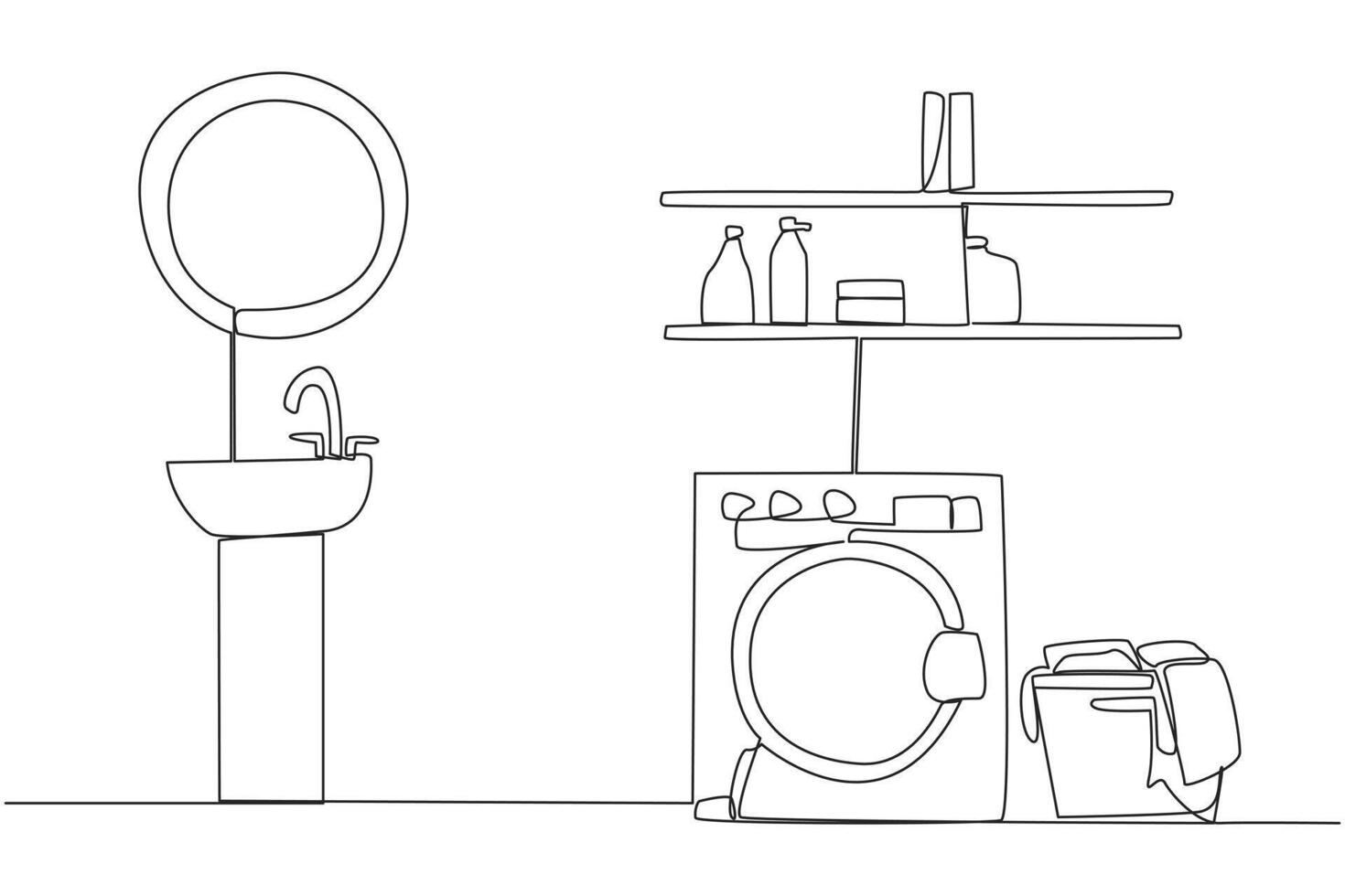 Single continuous line drawing Washing room with minimalist design. There is a front loading washing machine. Simple design interior. Elegant. Clean and clear. One line design illustration Pro Vector