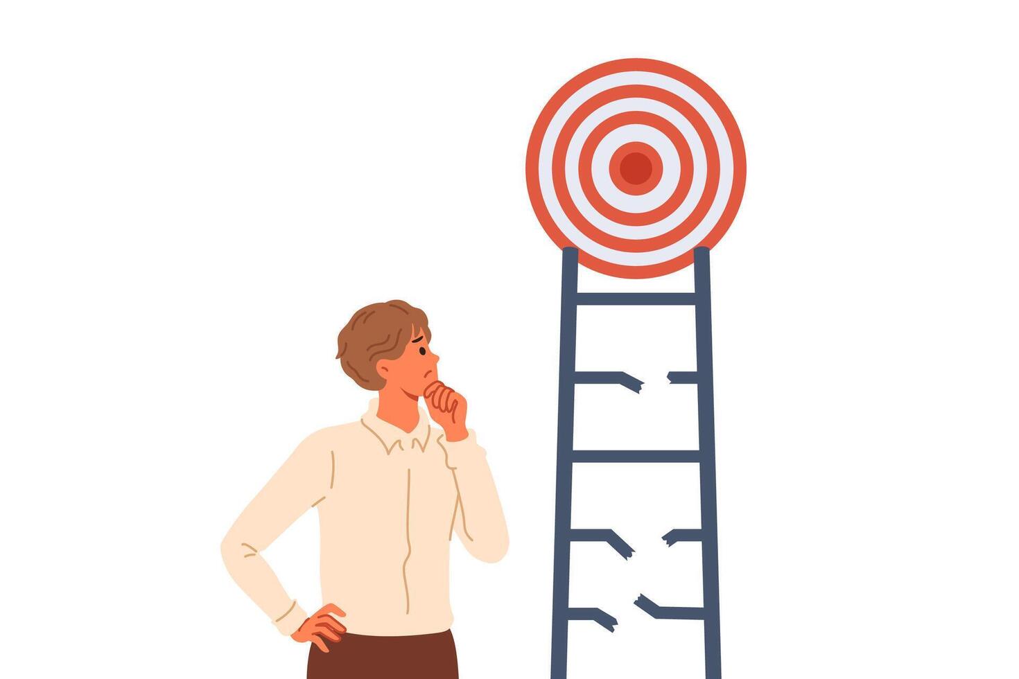 Problem on way to achieving goal for business man, thoughtfully examining broken ladder with target Pro Vector