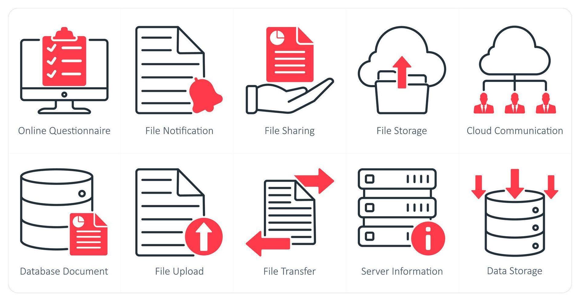 A set of 10 seo icons as online questionnaire, file notification, file sharing Pro Vector