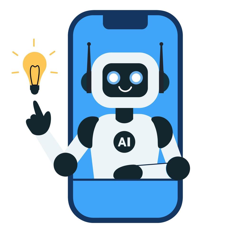 The robot on the phone points to the light bulb and develops an innovative business idea or strategy. Pro Vector