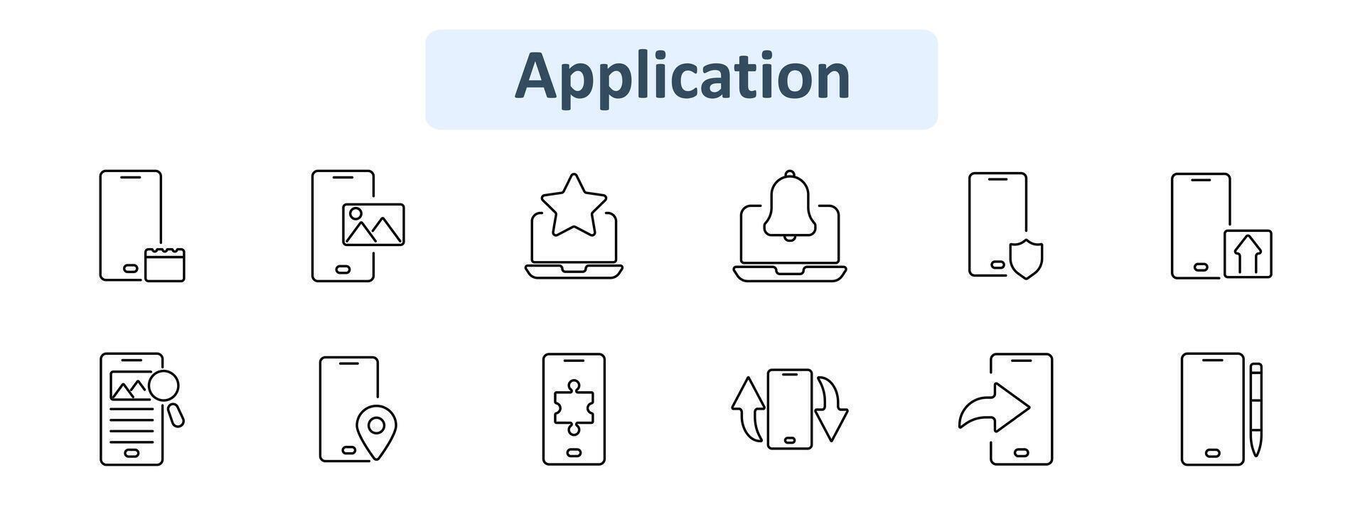 Application set icon. Mobile and desktop functions including calendar, photo gallery, favorites, notifications, security, uploads, search, location, settings, rotation, share. Digital communication Pro Vector