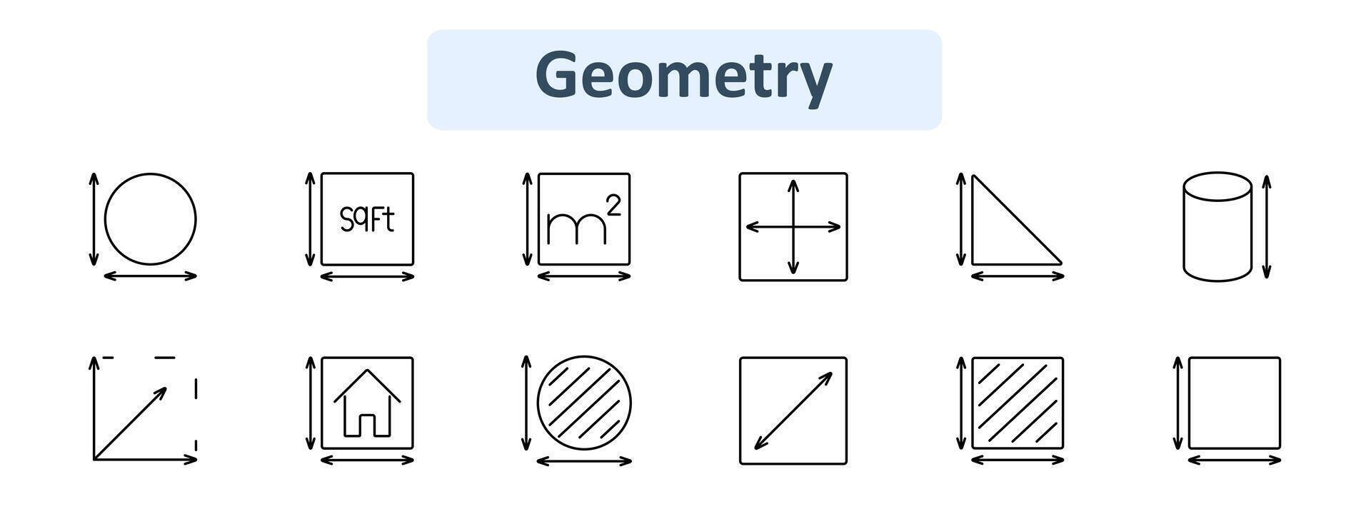 Geometry set icon. Circle, square feet, square meter, dimension arrows, triangle, cylinder, diagonal, house, striped circle, striped square. Geometric shapes, measurement, spatial awareness Pro Vector