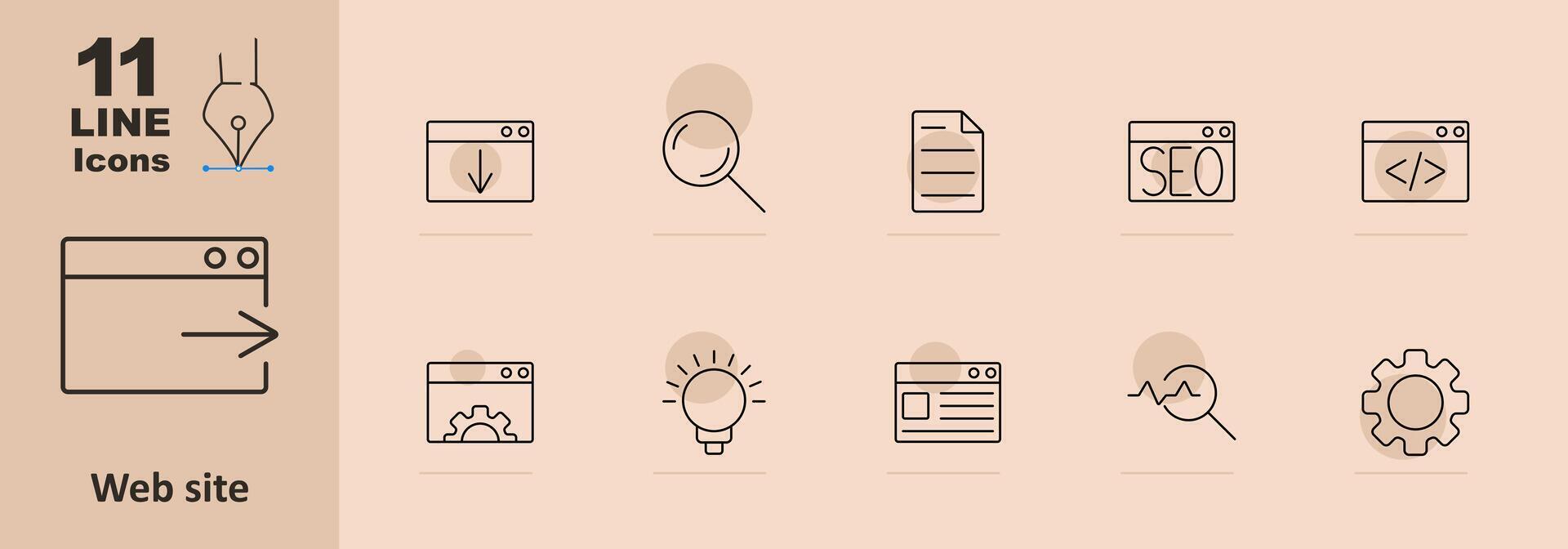 Website set icon. Browser, magnifying glass, document, SEO, code, gear, light bulb, analytics, download, interface, web, search, internet, development, optimization, website, technology. Pro Vector