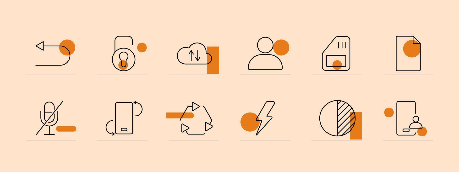 Application set icon. Mobile warning, keypad, play button, coins, settings, wallet, touch, calculator, call, laptop, globe, microphone. Digital interface and utility concept. Pro Vector
