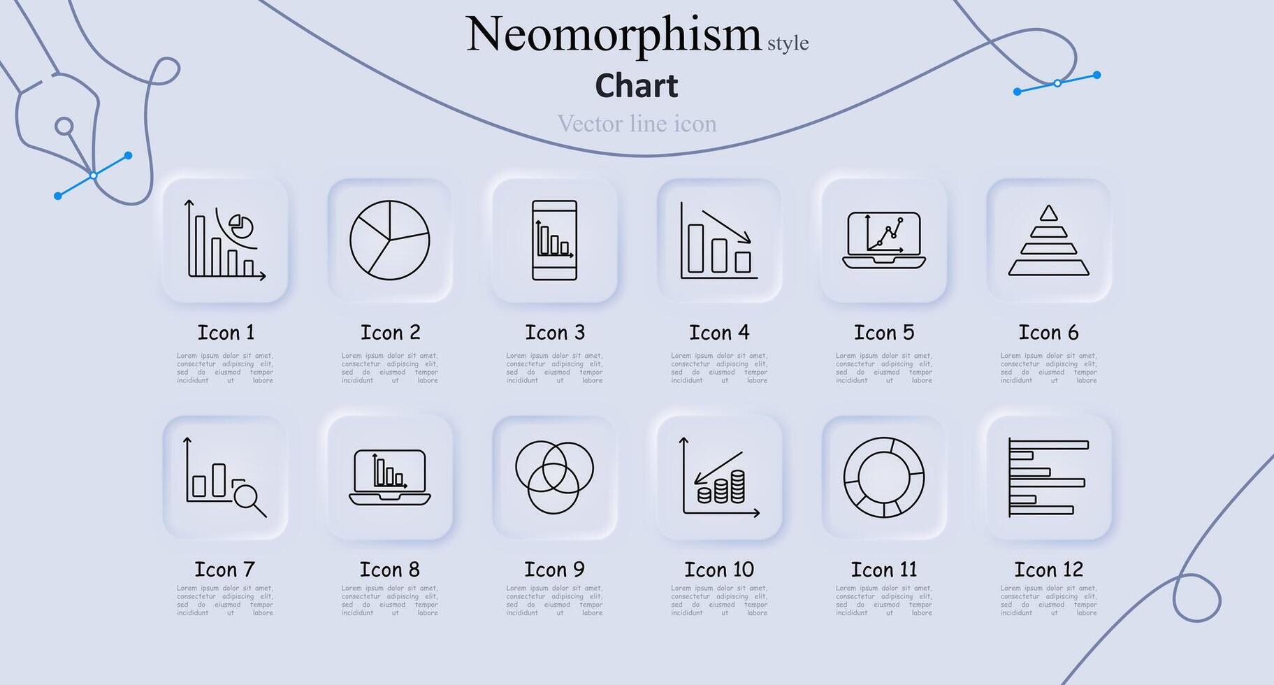Chart set icon. Bar chart, pie, histogram, line graph, laptop with graph, pyramid, magnifying glass, scatter plot, circle, venn diagram. Data, analytics, and statistics concept Pro Vector