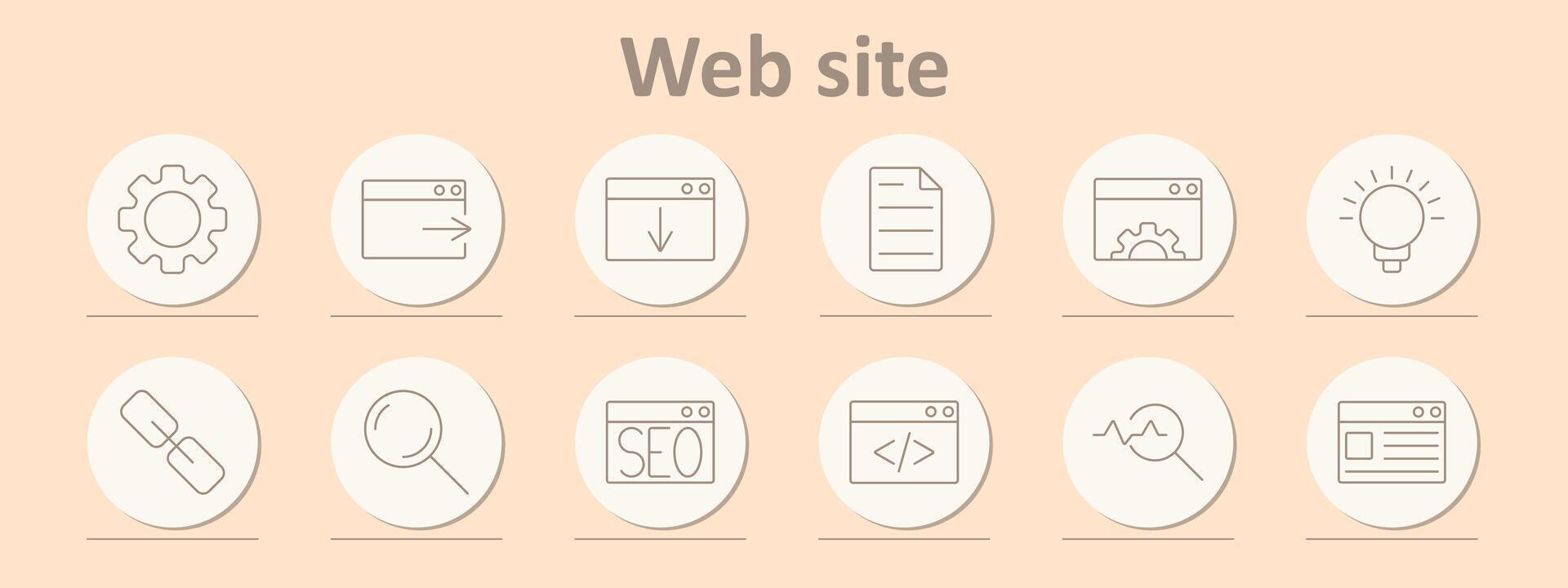 Website set icon. Gear, navigation, download, document, settings, idea, link, search, SEO, coding, analytics, web page. Pro Vector