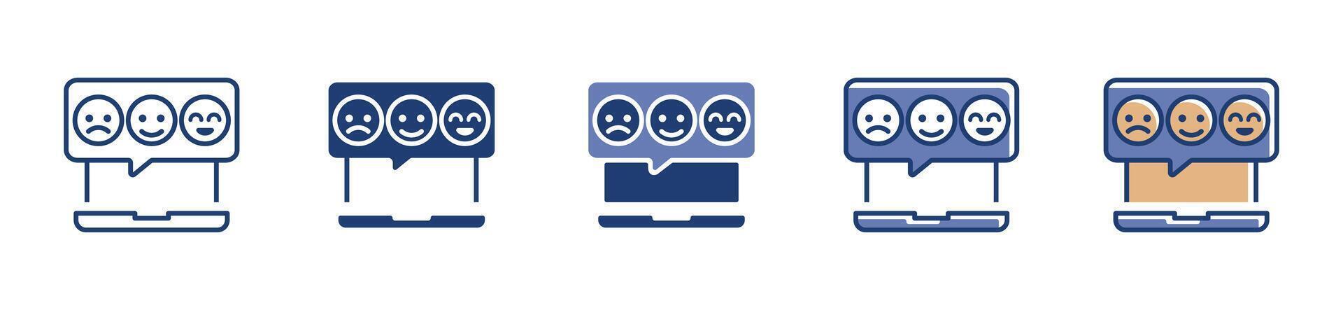 Feedback or review satisfaction evaluation icon collection with technology laptop app or web signs with emoticon face expression Pro Vector
