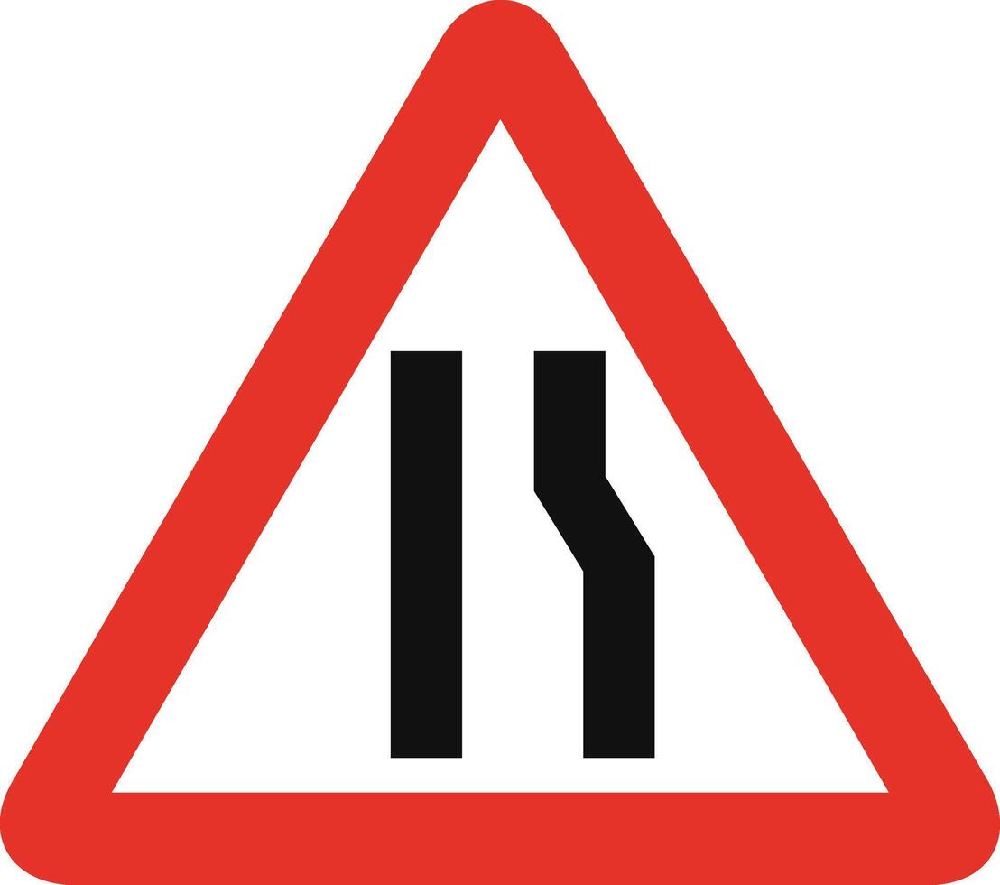 Triangular traffic signal in white and red, isolated on white background. Warning of narrow road ahead on right side Pro Vector
