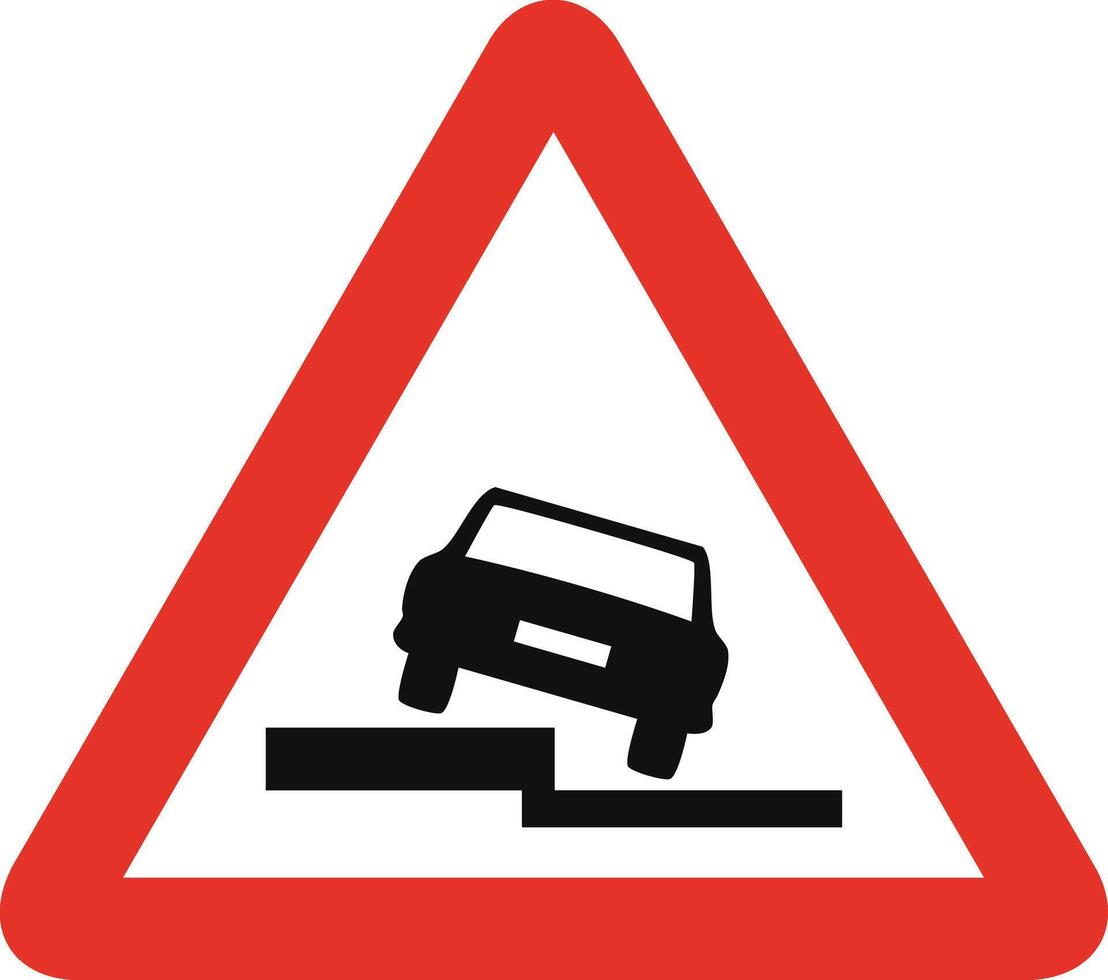 Triangular traffic signal in white and red, isolated on white background. Warning of side slope on the left Pro Vector