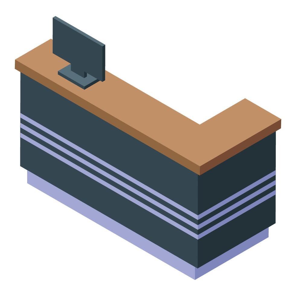 Modern l shaped reception desk with computer displaying important information Pro Vector