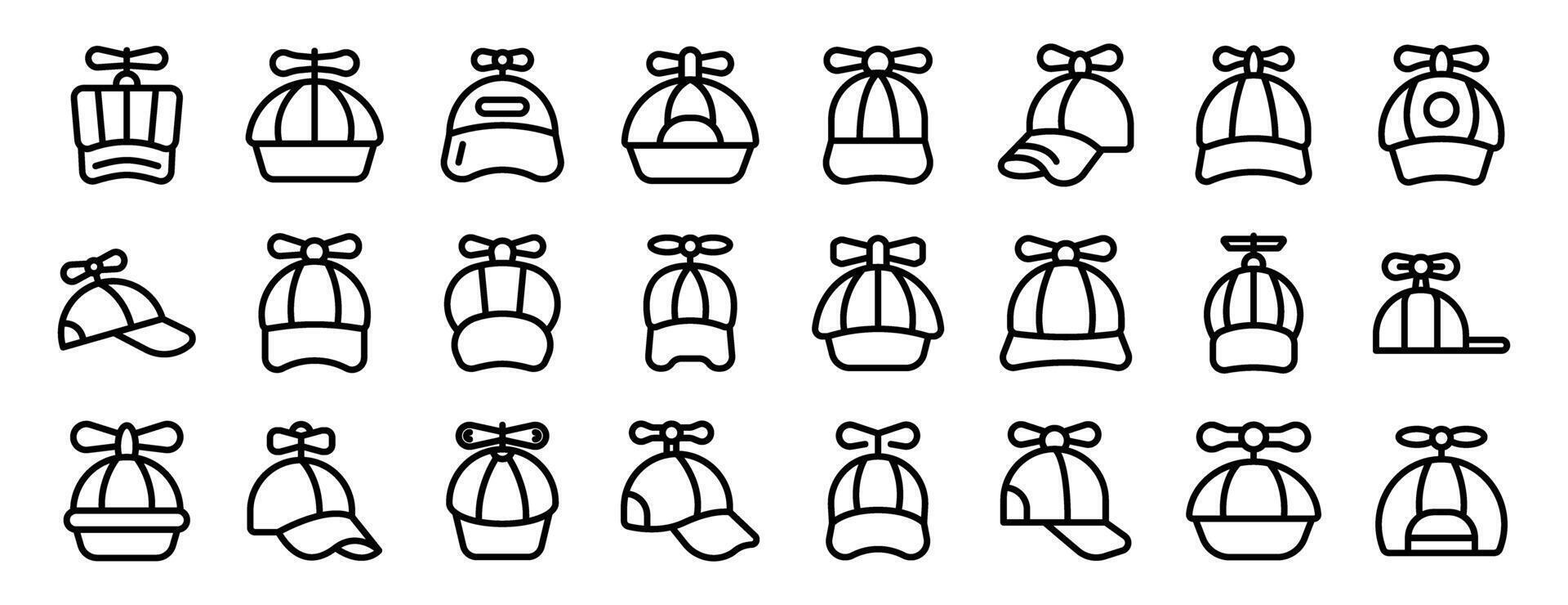 Cap propeller icons set. Set of different helicopter hat icons showing different styles and perspectives Pro Vector