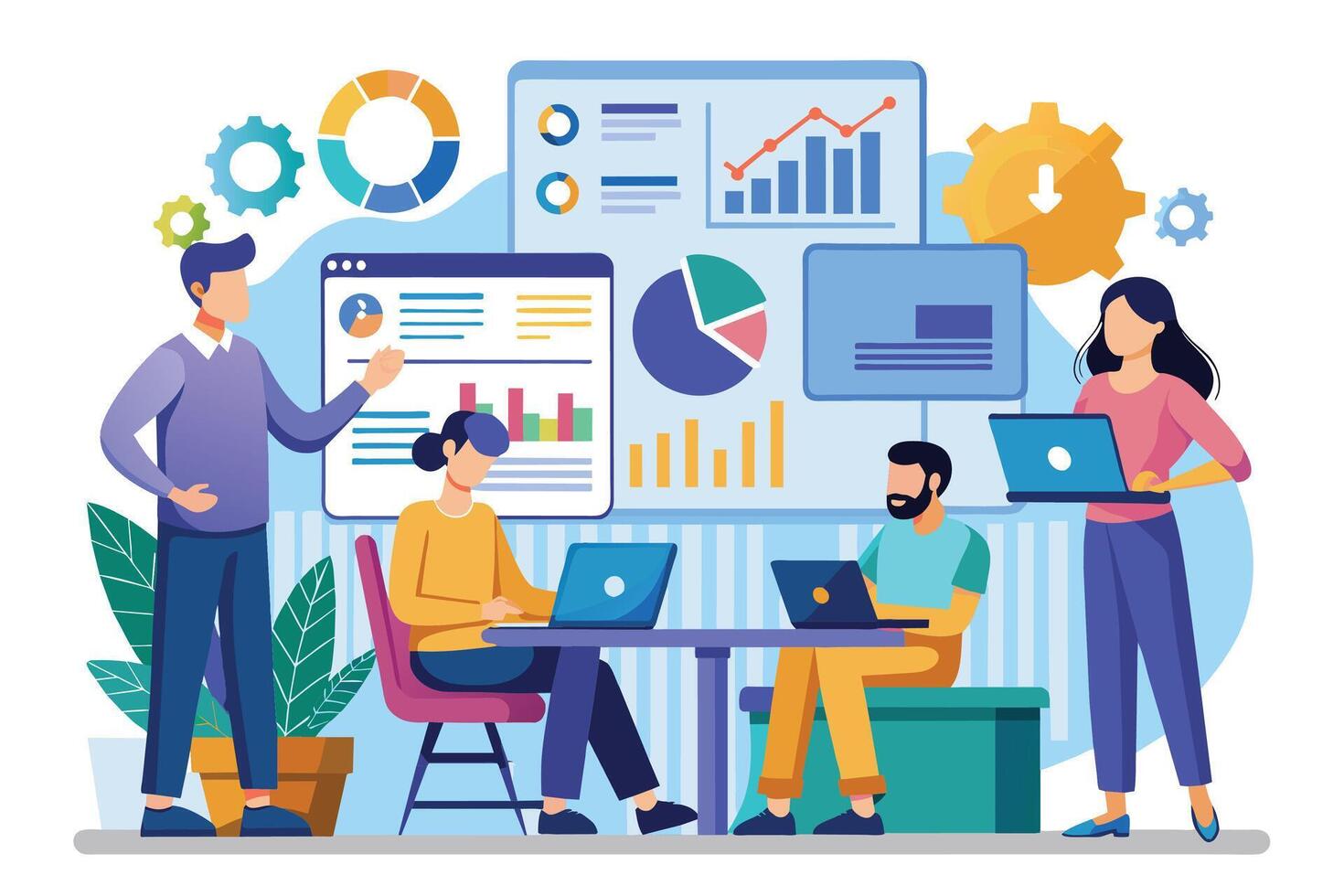 A team of four people are gathered around a table, reviewing data and charts on laptops and a whiteboard. vector