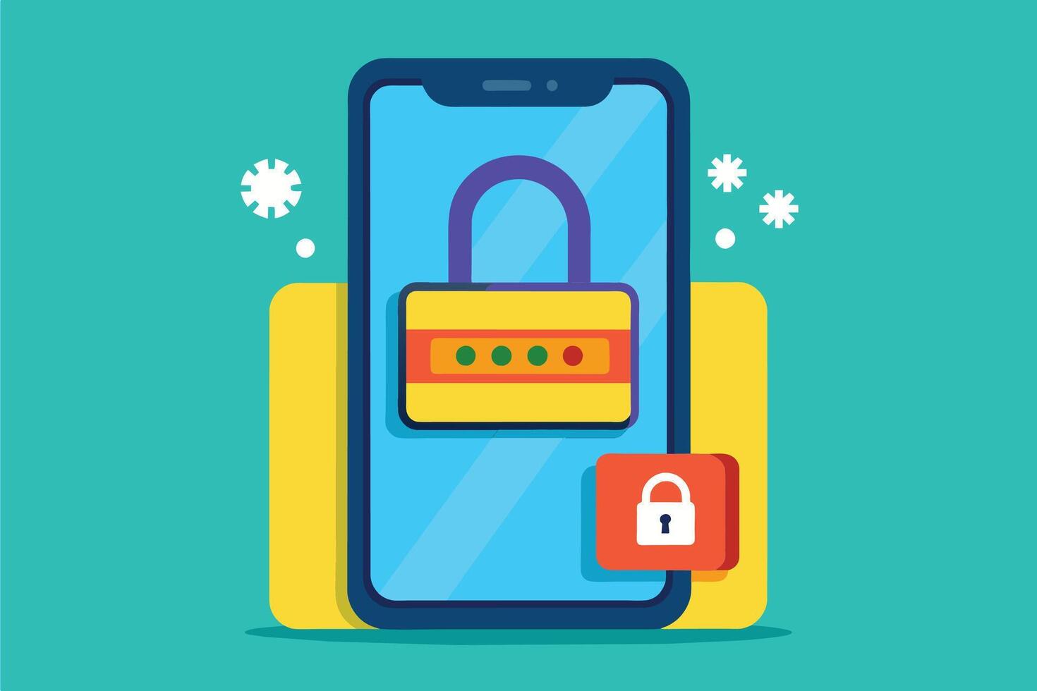 An illustration of a smartphone screen displaying a locked padlock with a password access panel, set against a teal background. vector