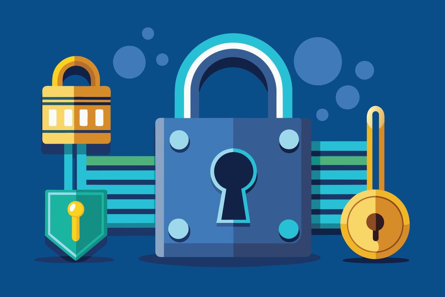 A digital illustration of a closed padlock and keys on a blue background. The padlock is large and blue with a keyhole, while the keys are smaller and golden. vector