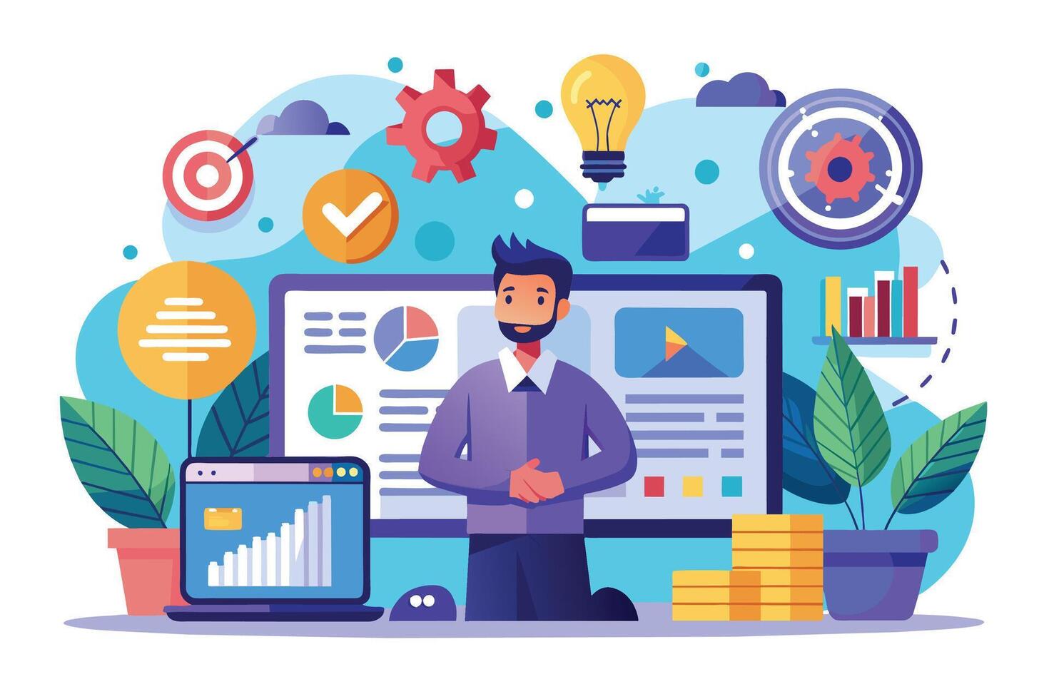 An illustration of a man with a beard standing in front of a computer screen filled with data charts and graphs, representing business analytics. vector