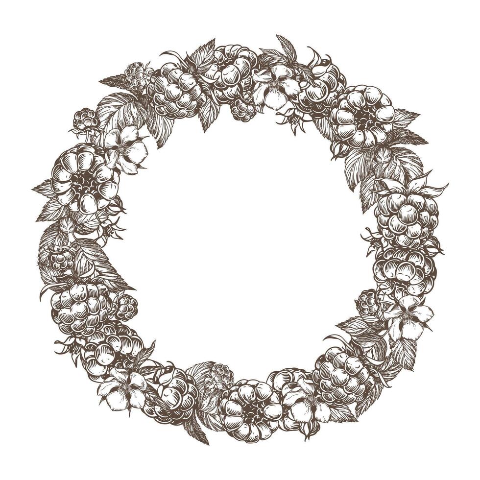 Sketch of a raspberry wreath. Round frame of years, flowers, branches and leaves on a white background. , linear illustration in the style of an old engraving. Packaging images. Pro Vector